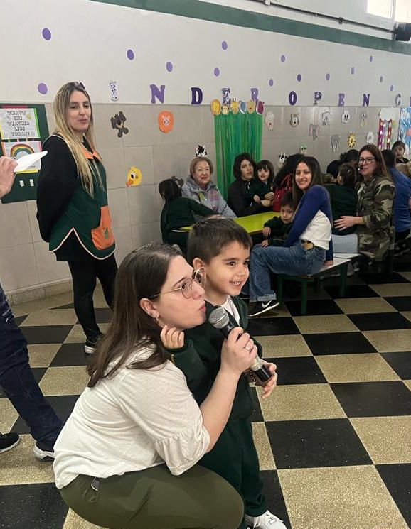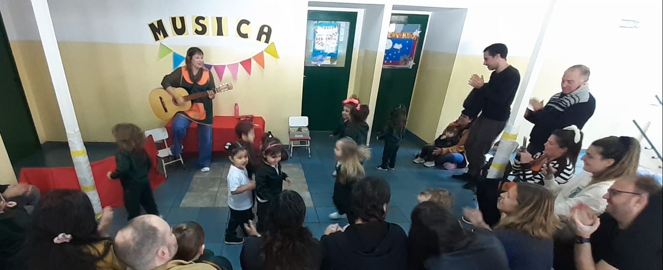 En el área de Música, se destaca la cálida voz de nuestra Profesora Melina, quien ha seleccionado las melodías más dulces y divertidas para este encuentro. Acompañada por su inseparable “Milonguita”, su guitarra compañera, le puso ritmo y alegría al encuentro con las familias… Los niños y las niñas disfrutan habitualmente en sus clases, de diversos géneros e instrumentos musicales, donde el cuerpo y el movimiento libre se hacen siempre presentes.
