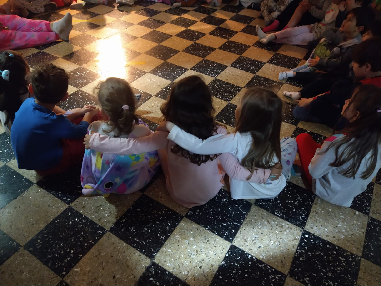 Al caer la noche jugamos con linternas en el patio y compartimos una deliciosa cena todos juntos. Antes de irnos a descansar, preparamos nuestras bolsas de dormir, ordenamos los elementos, hicimos un desfile para el baile del pijama y escuchamos un capítulo de la novela que nos acompañó todo el año: “Puki” de Margarita Mainé. Al levantarnos al día siguiente, pudimos ordenar con ayuda nuestras pertenencias, desayunar y confeccionar “fantasmitas”. Antes de finalizar, los chicos y las chicas obtuvieron de regalo unas coloridas pelotas y unos distintivos de egresados que los acompañarán en la Fiesta de fin de año.